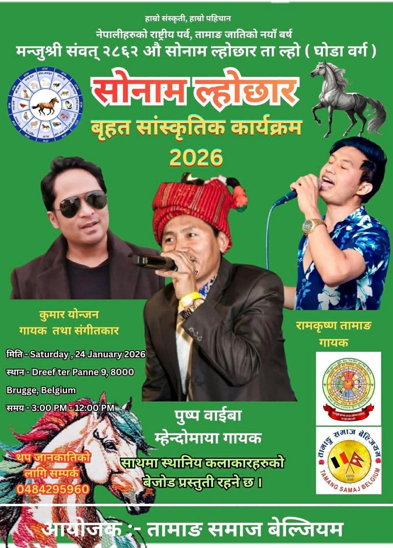 यही २०२६, जनावरी २४ तारीख सनिबारका दिन तामाङ समाज बेल्जियमको आयोजनमा २८६२ सोनाम ल्होछार(ता ल्हो,घोडा वर्ग) कार्यक्रम बेल्जियमको पर्यटकीय सुन्दर शहर ब्रुजमा भव्य रुपमा सम्पन्न भएको छ। तामाङ समाज बेल्जियमकी अध्यक्ष लालिङ तामाङको अध्यक्षतामा आरम्भ भएको कार्यक्रम मा लामा घ्याछो तामाङद्वारा पुजापाठ गरी उपस्थित सवैले वाङ थापी,आर्शिवाद लिएका थिए ।