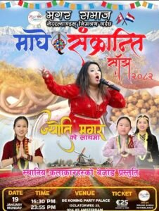 बिगत बर्ष झैँ यस बर्ष पनि एकता,मित्रता,आपसी सहयोग,सद्भाव आदान प्रदान गर्ने उदेश्यले मगर समाज नेदरल्याण्ड्सले ख्यातिप्राप्त कलाकारहरुको साथ् धुमधामले माघे संग्रान्ति पर्व मनाउन लागेको हो।