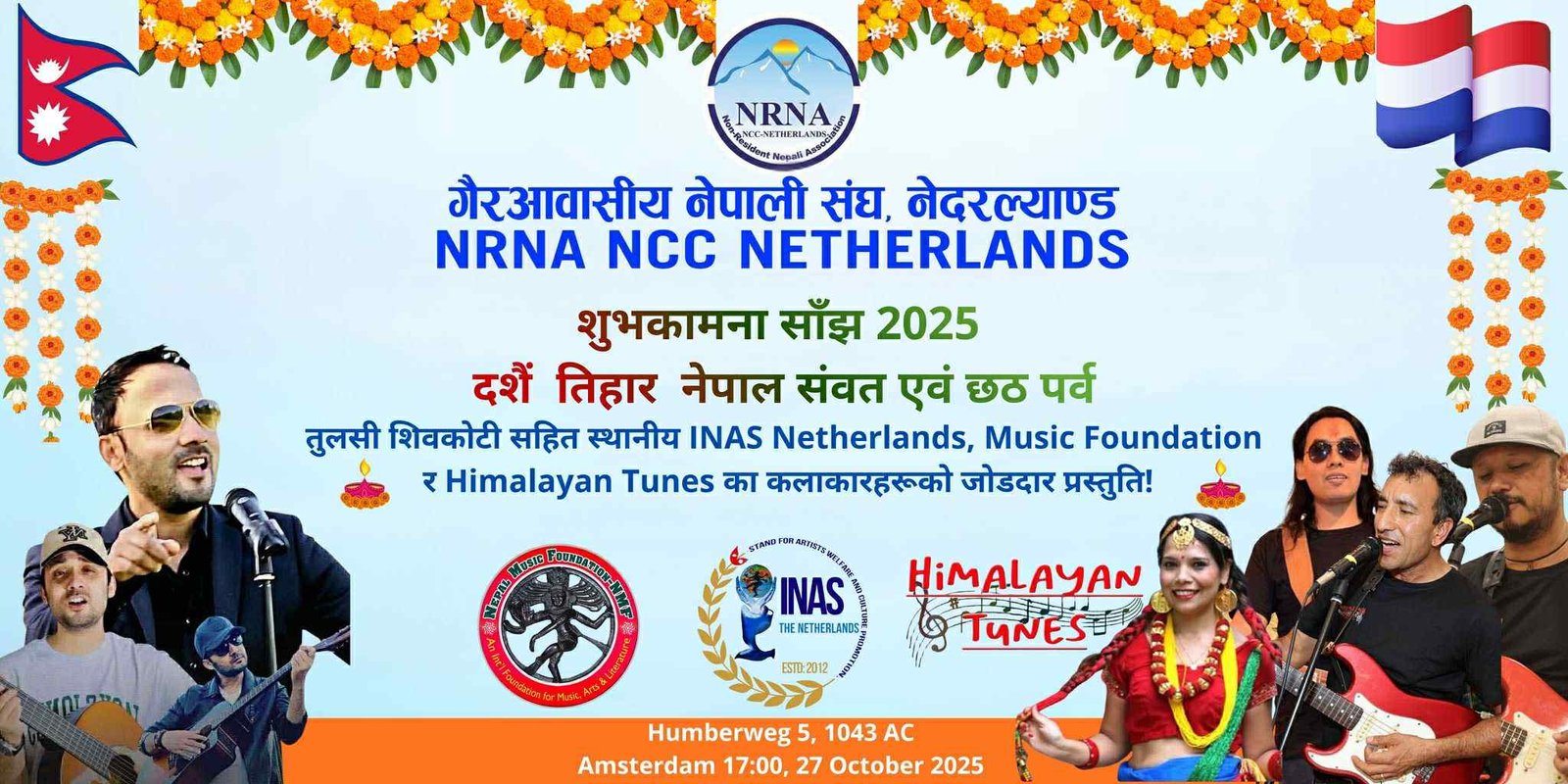गैर आवासीय नेपाली संघ राष्ट्रिय समन्वय समिति नेदरल्याण्ड्सले बिगत झै यो बर्ष पनि अक्टोबर २७ तारीख सोमबारका दिन महान चाड दशैं तिहार,नेपाल सम्वत,छठ पर्व लगायतका पर्वहरुलाई मध्यनजर गर्दै “शुभकामना साँझ २०२५” कार्यक्रम आयोजना गर्ने भएको छ ।